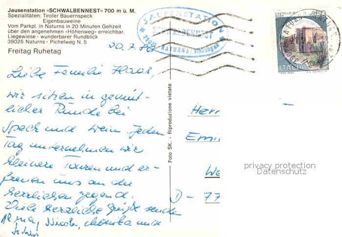 old postcard Naturns Jausenstation Schwalbennest Panorama Vinschgau postalisch gelaufen Erhaltung siehe scans [FriedD77]