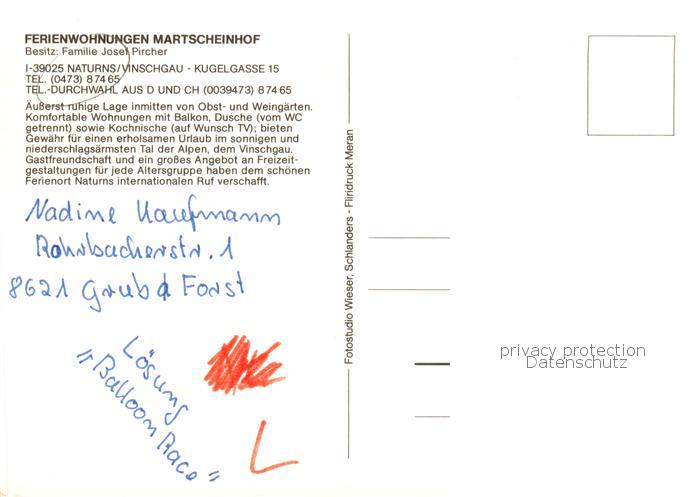 Naturns Naturno Suedtirol IT Ferienwohnungen Martscheinhof postalisch nicht gelaufen Erhaltung siehe scans [WerneD78]