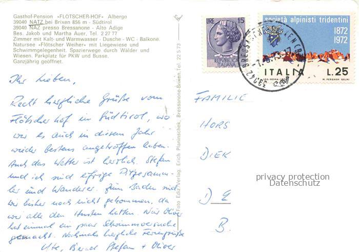 74132351 old postcard Natz Brixen Suedtirol Bolzano IT Gasthof Pension Floetscher Hof Albergo Gastraum Panorama Partie am See postalisch gelaufen Erhaltung siehe scans [FriedD77] KatCode: 11240
