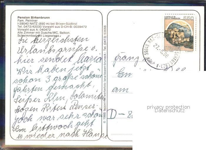 old postcard Natz Brixen Suedtirol Pension Birkenbrunn Swimmingpool Panorama postalisch gelaufen Erhaltung siehe scans