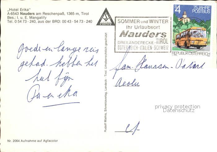 72481734 alte Postkarte Nauders Tirol Hotel Erika postalisch gelaufen Erhaltung siehe scans KatCode: 11390334070615