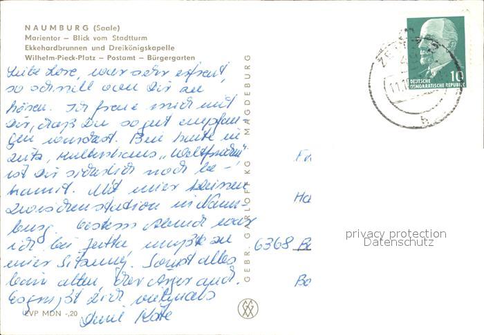 72091931 alte Postkarte Naumburg Saale Marientor Stadtturm Ekkehardbrunnen Dreikoenigskapelle Wilhelm Pieck Platz Postamt Buergergarten postalisch gelaufen Erhaltung siehe scans KatCode: 11110015084355