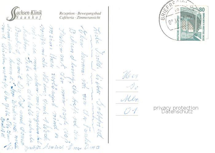 73774700 alte Postkarte Naunhof Leipzig Sachsenklinik Rezeption Hallenbad Gastraum Zimmer postalisch gelaufen Erhaltung siehe scans [WerneD78] KatCode: 11110014383220