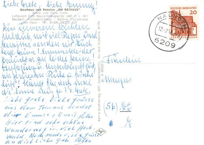 73924723 alte Postkarte Nauroth Heidenrod Burg Gerold Wispertal Naurother Schweiz Laukenmuehle Wisperquelle Gasthaus Pension Am Rathaus Reitbank Lauksburg Weizenwiese Kath Kirche Harzbachtal postalisch gelaufen Erhaltung siehe scans [WerneD78] KatCode: 11110006439005