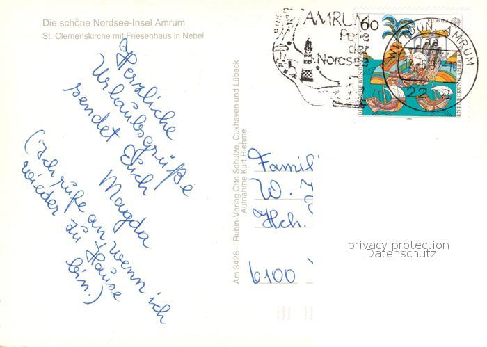 73268906 alte Postkarte Nebel Amrum St Clemenskirche mit Friesenhaus postalisch gelaufen Erhaltung siehe scans [FriedD77] KatCode: 11110001054085