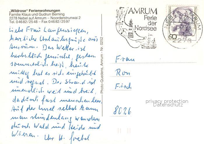 73752650 alte Postkarte Nebel Amrum Wildrose Ferienwohnungen postalisch gelaufen Erhaltung siehe scans [LiesaD40] KatCode: 11110001054085
