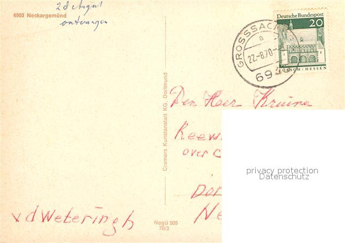 72935646 alte Postkarte Neckargemuend Blick ueber den Neckar zur Kirche Dampfer postalisch gelaufen Erhaltung siehe scans [FriedD77] KatCode: 11110008226056