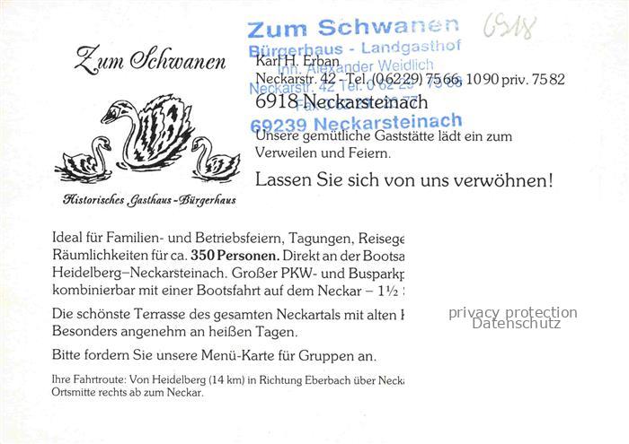 74048974 Neckarsteinach Buergerhaus Zum Schwanen Gastraeume Neckarpartie postalisch nicht gelaufen Werbekarte (keine Postkarte) Erhaltung siehe scans [WerneD78] KatCode: 11110006431018