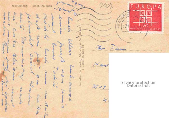 74051029 alte Postkarte Neckarsulm BW Staedtische Anlagen Blick zur Kirche postalisch gelaufen Erhaltung siehe scans [FriedD77] KatCode: 11110008125065