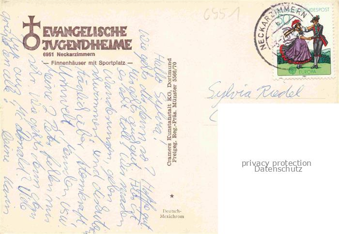 74047991 alte Postkarte Neckarzimmern Evangelische Jugendheime Finnenhaeuser mit Sportplatz postalisch gelaufen Fliegeraufnahme Erhaltung siehe scans [FriedD77] KatCode: 11110008225067