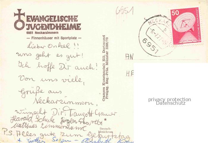 74048363 alte Postkarte Neckarzimmern Evangelische Jugendheime Finnenhaeuser Sportplatz postalisch gelaufen Fliegeraufnahme Erhaltung siehe scans [FriedD77] KatCode: 11110008225067