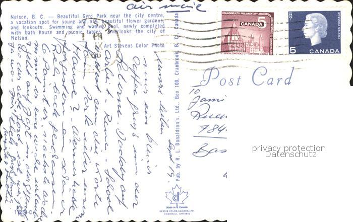 old postcard Nelson British Columbia Gyro Park postalisch gelaufen Erhaltung siehe scans