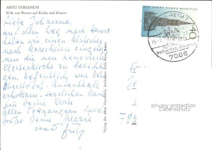 72419081 alte Postkarte Neresheim Abtei Kirche Kloster Fliegeraufnahme postalisch gelaufen Erhaltung siehe scans KatCode: 11110008136045