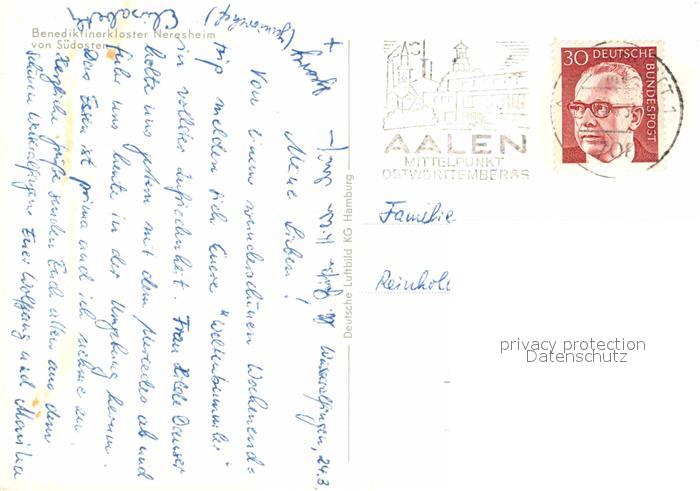 72837151 alte Postkarte Neresheim Benediktinerkloster Fliegeraufnahme postalisch gelaufen Erhaltung siehe scans [FriedD77] KatCode: 11110008136045