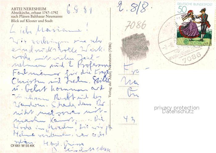 72839319 alte Postkarte Neresheim Ortsansicht mit Blick zur Abtei Kloster postalisch gelaufen Erhaltung siehe scans [FriedD77] KatCode: 11110008136045