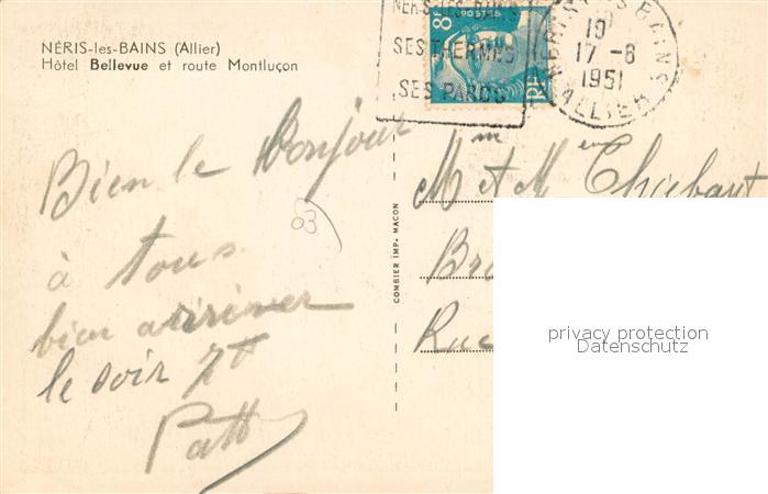 13710467 Neris-les-Bains 03 Hotel Bellevue et route Montlucon postalisch gelaufen Erhaltung siehe scans [LiesaD40] carte postale Lies Katcode 11170003103195