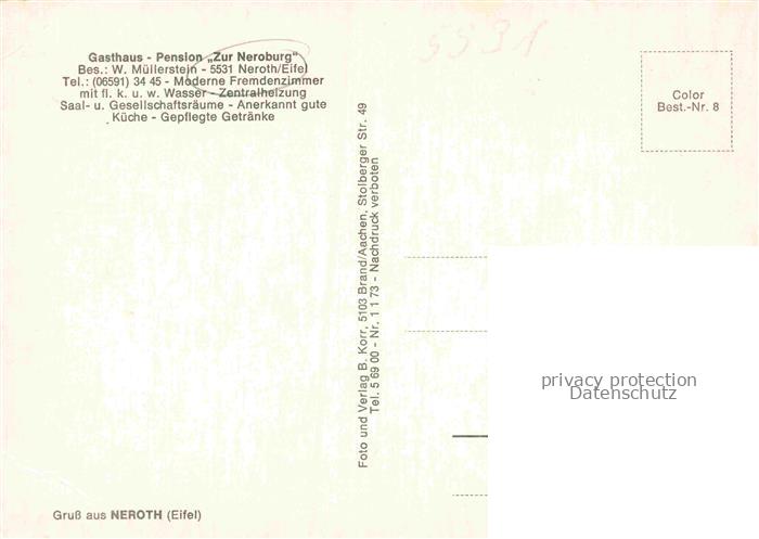 74166635 Neroth Eifel Vulkaneifel Rheinland-Pfalz Gasthaus-Zur-Neroburg Dorfpanorama Huegel Eifel Wiesen Kirchturm postalisch nicht gelaufen Erhaltung siehe scans [Karloger] KatCode: 11110007233050