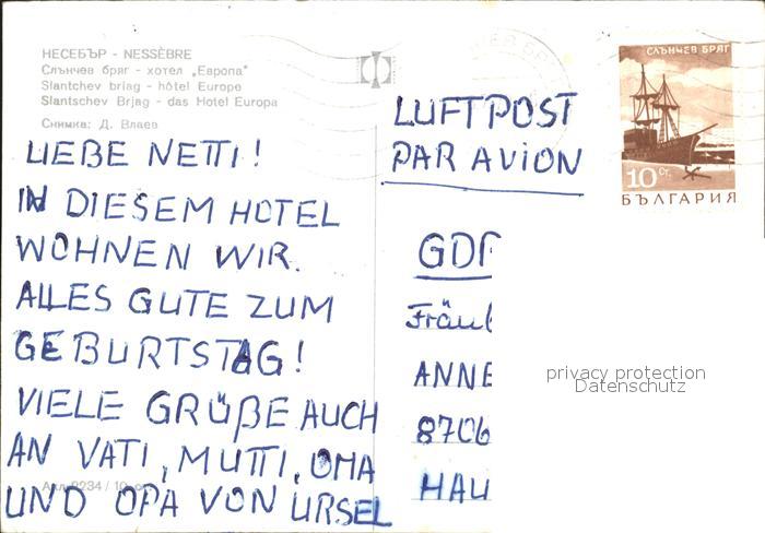 old postcard Nessebar Nessebyr Nessebre Slantschev Brjag Hotel Europa postalisch gelaufen Erhaltung siehe scans
