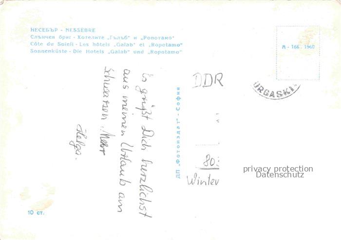 74017227 old postcard Nessebre Nessebar Nessebyr BG Hotel Galabs und Ropotamo postalisch gelaufen Erhaltung siehe scans [WerneD78] KatCode: 11090