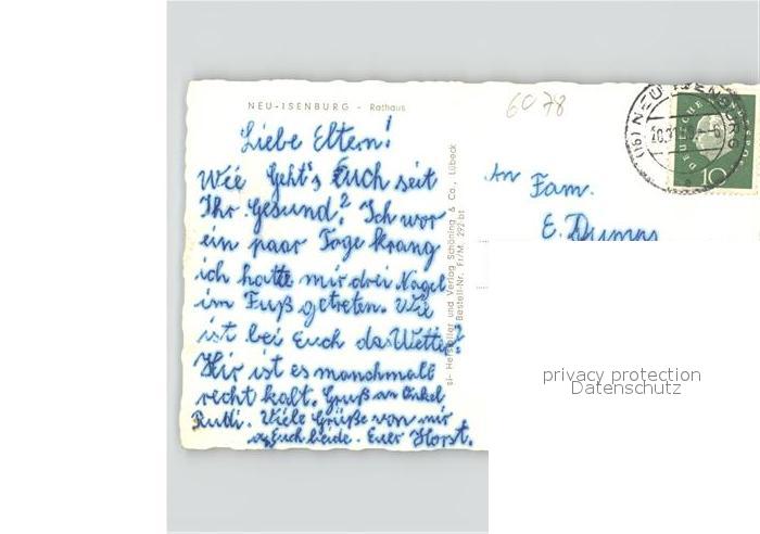 41619754 alte Postkarte Neu-Isenburg Rathaus Autos postalisch gelaufen Erhaltung siehe scans KatCode: 11110006438009