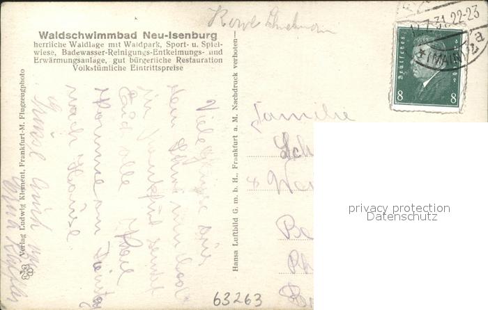 31910307 alte Postkarte Neu-Isenburg Waldschwimmbad Fliegeraufnahme postalisch gelaufen Erhaltung siehe scans KatCode: 11110006438009