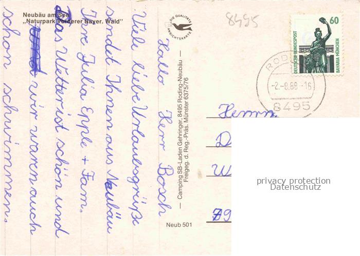 74049038 alte Postkarte Neubaeu am See Roding Bayern Campingplatz Naturpark Vorderer Bayerischer Wald postalisch gelaufen Fliegeraufnahme Erhaltung siehe scans [FriedD77] KatCode: 11110009372153