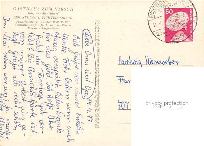 73858932 alte Postkarte Neubau Fichtelberg Gasthaus zum Hirsch Gastraeume postalisch gelaufen Erhaltung siehe scans [WerneD78] KatCode: 11110009472138
