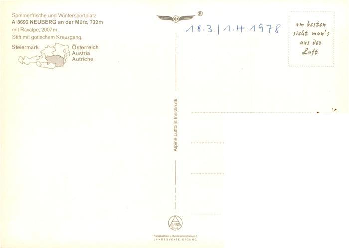 73904871 Neuberg Muerz Steiermark AT mit Raxalpe postalisch nicht gelaufen Fliegeraufnahme Erhaltung siehe scans [FriedD77] KatCode: 11390223061312