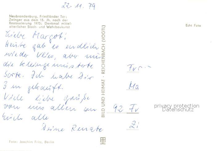 73033647 alte Postkarte Neubrandenburg Friedlaender Tor Zwinger Denkmal postalisch gelaufen Erhaltung siehe scans [KathaD81] KatCode: 11110013002000