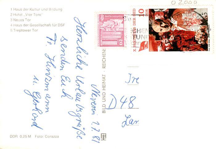 73908022 alte Postkarte Neubrandenburg Haus der Kultur und Bildung Hotel Vier Tote Neues Tor Haus der Gesellschaft fuer DSF Treptower Tor postalisch gelaufen Erhaltung siehe scans [WerneD78] KatCode: 11110013002000