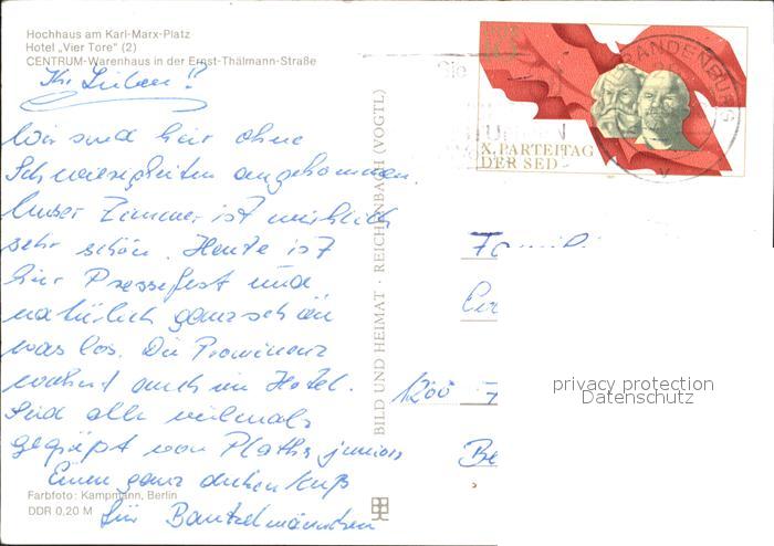 72023490 alte Postkarte Neubrandenburg Hochhaus Karl- Marx- Platz Hotel Vier Tore postalisch gelaufen Erhaltung siehe scans KatCode: 11110013002000