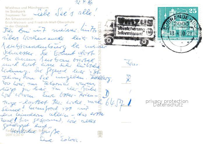 73267921 alte Postkarte Neubrandenburg Wiekhaus Moenchenturm Erich-Weinert- und Friedrich-Wolf-Oberschule postalisch gelaufen Erhaltung siehe scans [PaolaD17] KatCode: 11110013002000