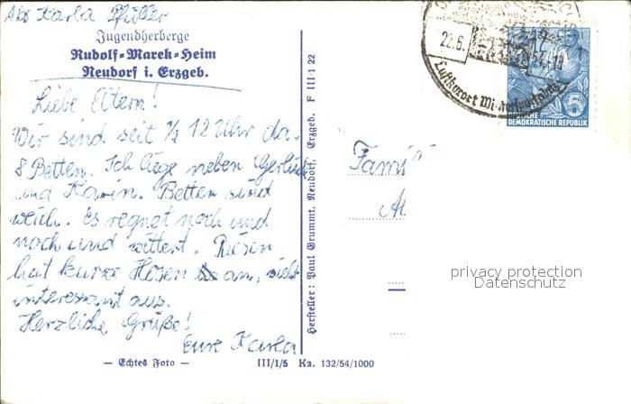72010063 alte Postkarte Neudorf Erzgebirge Jugendherberge Rudolf Marek Heim postalisch gelaufen Erhaltung siehe scans KatCode: 11110014171240