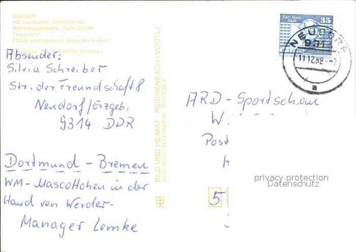 72071685 alte Postkarte Neudorf Erzgebirge panorama HO Gaststaette Vierenstr Betriebsgaststaette Gute Quelle FDGB Haus des Volkes postalisch gelaufen Erhaltung siehe scans KatCode: 11110014171240
