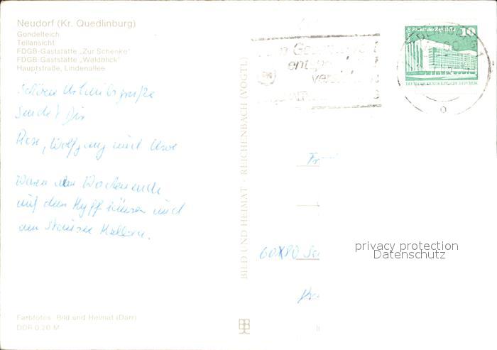 72135942 alte Postkarte Neudorf Quedlinburg Gondelteich FDGB Gaststaette Haupstrasse Lindenallee postalisch gelaufen Erhaltung siehe scans KatCode: 11110015085220