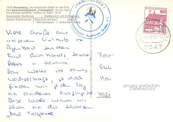73214926 alte Postkarte Neuenbuerg Enz Marktplatz Brunnen Fachwerkhaeuser Besucherbergwerk Frischglueck Landschaftspanorama postalisch gelaufen Erhaltung siehe scans [FriedD77] KatCode: 11110008236043