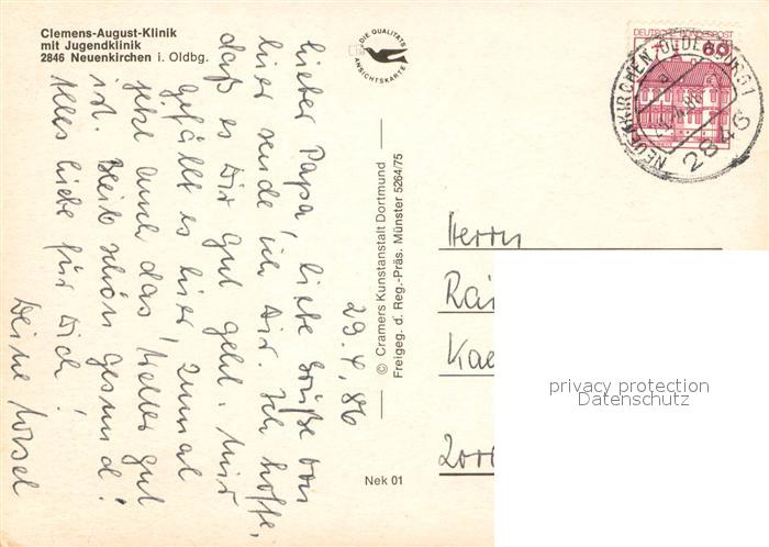 73725712 alte Postkarte Neuenkirchen Oldenburg Clemens August Klinik mit Jugendklinik Fliegeraufnahme postalisch gelaufen Erhaltung siehe scans [WerneD78] KatCode: 11110003460007