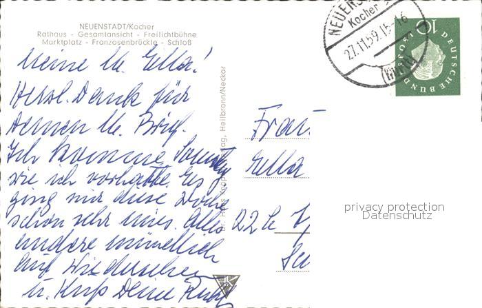72444876 alte Postkarte Neuenstadt Kocher Rathaus Stadtblick Freilichtbuehne Marktplatz Franzosenbruecke Schloss postalisch gelaufen Erhaltung siehe scans KatCode: 11110008125069