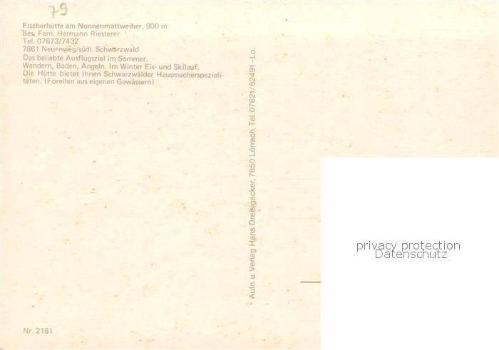 73836079 Neuenweg Fischerhuette am Nonnenmattweiher Schwarzwald postalisch nicht gelaufen Erhaltung siehe scans [FriedD77] KatCode: 11110008336060