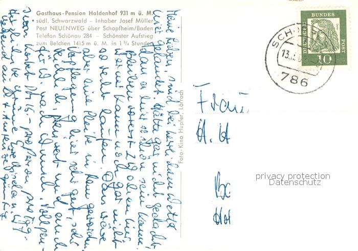 73678543 alte Postkarte Neuenweg Gasthaus Pension Haldenhof im Schwarzwald postalisch gelaufen Erhaltung siehe scans [FriedD77] KatCode: 11110008336060