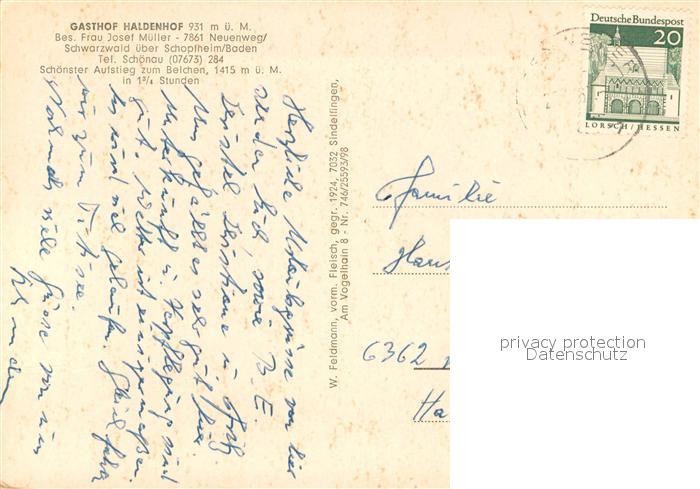 73720425 alte Postkarte Neuenweg Gasthof Haldenhof Teilansichten m. Nonnenmattweiher u. Strohmeyers Gedaechtsniskapelle postalisch gelaufen Erhaltung siehe scans [LiesaD40] KatCode: 11110008336060