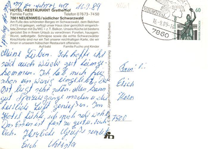 73934994 alte Postkarte Neuenweg Hotel Restaurant Gretherhof postalisch gelaufen Erhaltung siehe scans [WerneD78] KatCode: 11110008336060