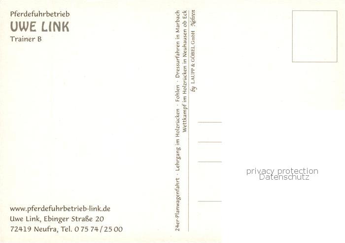 73835691 alte Postkarte Neufra Hohenzollern Pferdefuhrbetrieb Uwe Link Trainer B Planwagenfahren Holzruecken Fohlen Dressurfahren postalisch gelaufen Erhaltung siehe scans [WerneD78] KatCode: 11110008437082