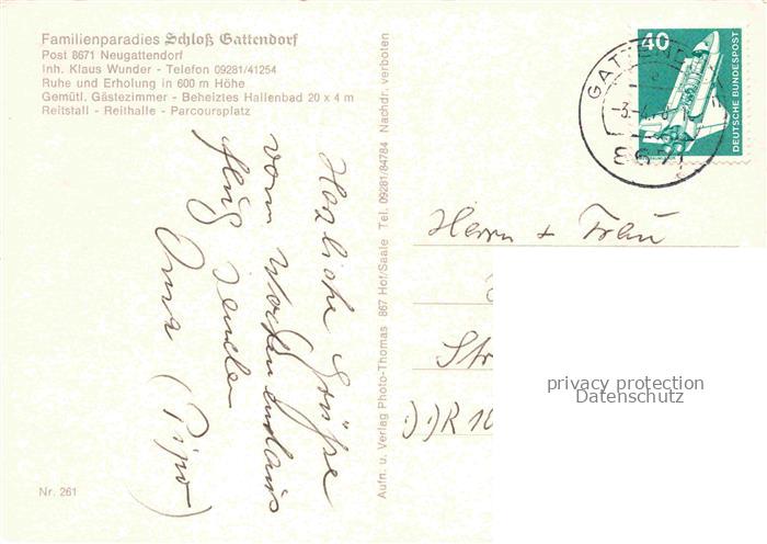 74026886 Neugattendorf HOF Bayern Schloss Gattendorf Hotel Restaurant Reitstall Parcoursplatz postalisch gelaufen Erhaltung siehe scans [FriedD77] alte Postkarte Frie Katcode 11110009475127