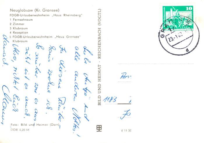 73924208 alte Postkarte Neuglobsow Stechlin FDGB Urlauberwohnheime Haus Rheinsberg und Haus Gransee Fernsehraum Zimmer Klubraum Rezeption postalisch gelaufen Erhaltung siehe scans [FriedD77] KatCode: 11110012065310