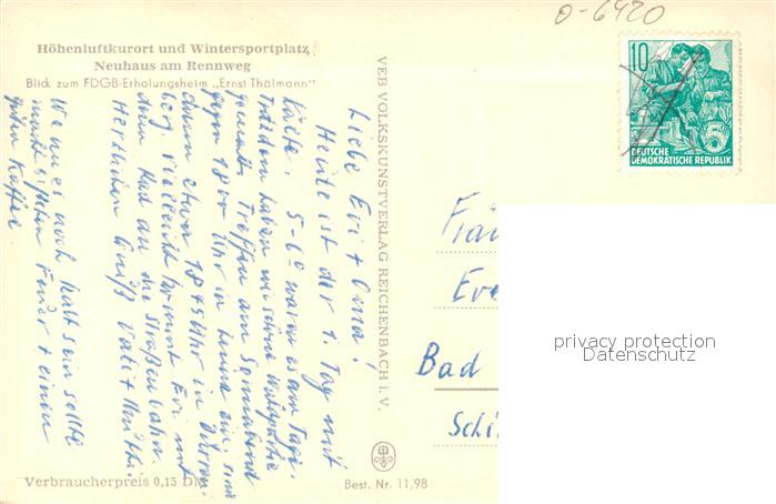 43367920 alte Postkarte Neuhaus Rennweg FDGB Erholungsheim Ernst Thaelmann postalisch gelaufen Erhaltung siehe scans [WerneD78] KatCode: 11110016072013