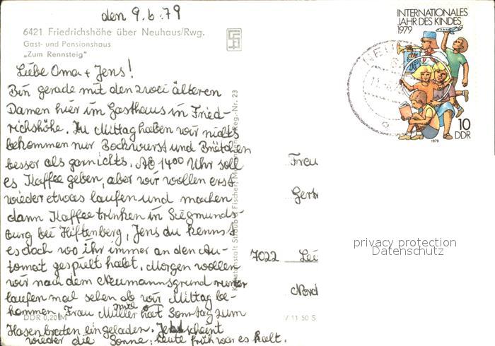 72019279 alte Postkarte Neuhaus Rennweg Friedrichshoehe Restaurant Pension Zum Rennsteige postalisch gelaufen Erhaltung siehe scans KatCode: 11110016072013