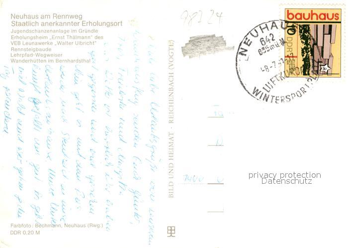 73041869 alte Postkarte Neuhaus Rennweg Schanze im Gruendle FDGB Erholungsheim Ernst Thaelmann Rennsteigbaude Lehrpfad Wegweiser Wanderhuetten Bernhardstal postalisch gelaufen Erhaltung siehe scans [WerneD78] KatCode: 11110016072013