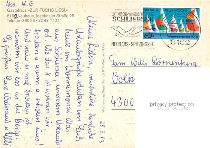 73543625 alte Postkarte Neuhaus Schliersee Gaestehaus Zur Fuchs Liesl postalisch gelaufen Erhaltung siehe scans [WerneD78] KatCode: 11110009182131