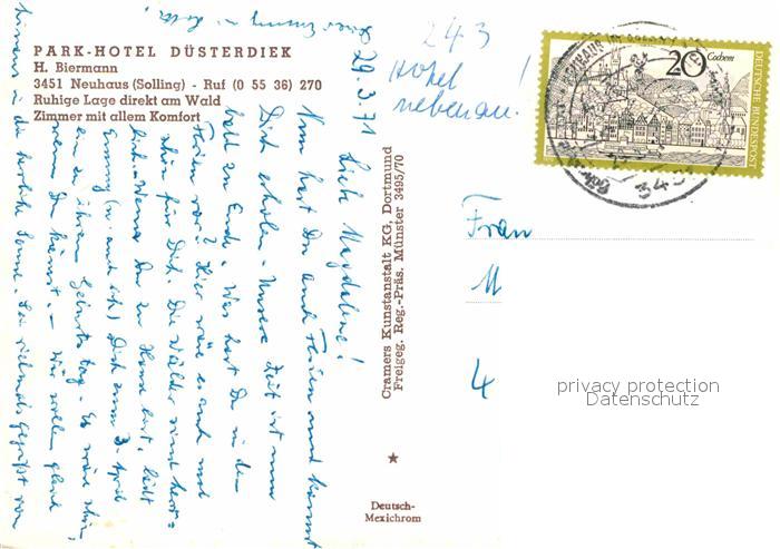 72913752 alte Postkarte Neuhaus Solling Fliegeraufnahme Park-Hotel Duestendiek postalisch gelaufen Erhaltung siehe scans [LiesaD40] KatCode: 11110003255023